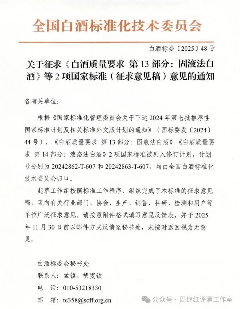 全國白酒標準化技術委員會發布的關于《白酒質量要求第13部分:固液法白酒》、《白酒質量要求 第14部分:液態法白酒》和《白酒感官品評術語》3項國家標準(征求意見稿)征求意見還有一周就結束了,有反饋意見的單位和用戶抓緊填寫意見反饋表,并于2025年11月30日前以郵件方式反饋至秘書處。