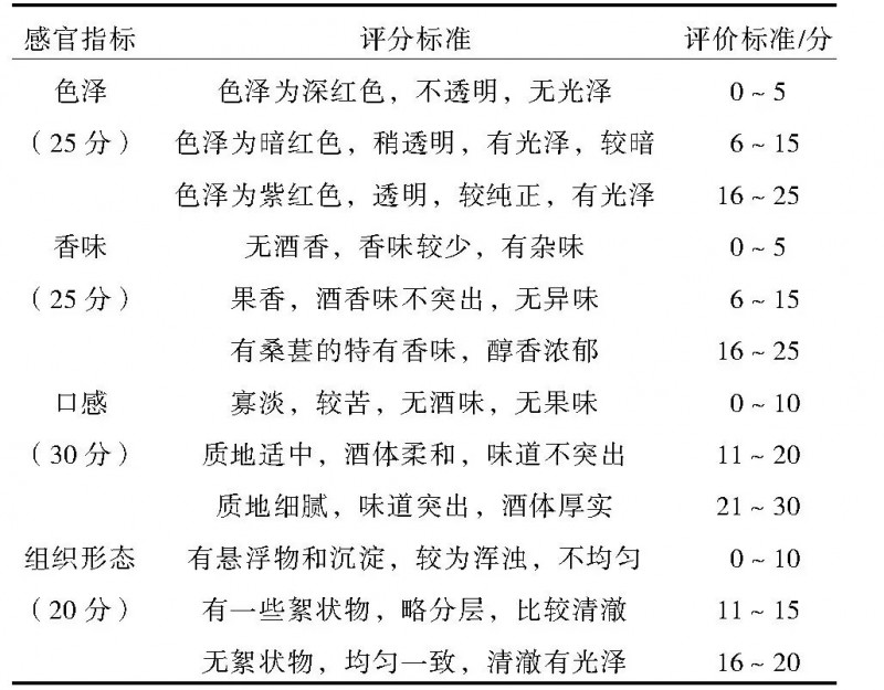 感官評價參考Yadav等和盧鑫宇等的報道進行。邀請7~10名有品酒經驗的人員對桑甚果酒進行品嘗,并從色澤、香味、口感、組織形態4個方面進行評價,將該得分的平均值計算為感官評估準則(表2)。
