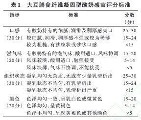根據柴振宇等制作的發酵乳感官評分表,邀請10位評價人員從口感、滋氣味、組織狀態、顏色等方面進行感官評價,感官評分標準見表1。
