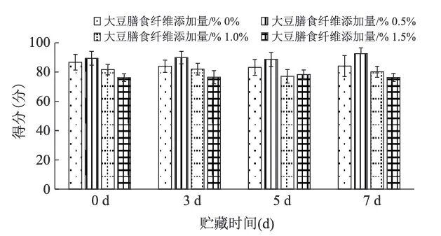 添加不同比例的大豆膳食纖維制備凝固型酸奶,在貯藏7d內,經10位評價人員的評分,得到酸奶的感官評價結果如圖4所示。添加大豆膳食纖維的酸奶底部出現輕微沉淀,四組酸奶的顏色相差不大,均為乳白色,因大豆膳食纖維本身纖維特性,入口后易出現不適的顆粒感,口感較為粗糙,使酸奶整體感官品質下降,從而降低評分。貯藏7d內各組發酵乳的感官并沒有顯著變化(P>0.05),添加0.5%大豆膳食纖維的酸奶在口感、滋氣味、組織狀態方面更令人滿意。