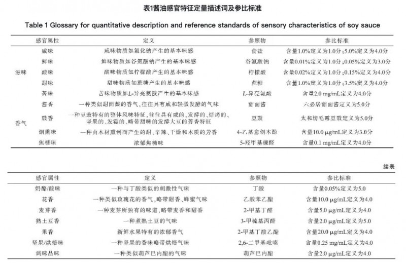 選擇7名(男4名,女3名)經(jīng)過感官培訓(xùn)的專業(yè)人員組成評價小組,確定醬油的12種香氣特征描述詞和5種滋味特征描述詞,并對所有的描述詞進行定義,確定其參照物和建立強度標度(見表1)。樣品制備參照項目組前期報道方法進行感官評價訓(xùn)練及測定過程采用定量描述分析(quantitative distriminant analvsis,QDA)方法,要求評價小組成員采用5分制對醬油樣品的風(fēng)味輪廓進行打分,其中強度描述為沒有感覺(0)、弱(1)、稍弱(2)、平均(3)、稍強(4)和強(5)。