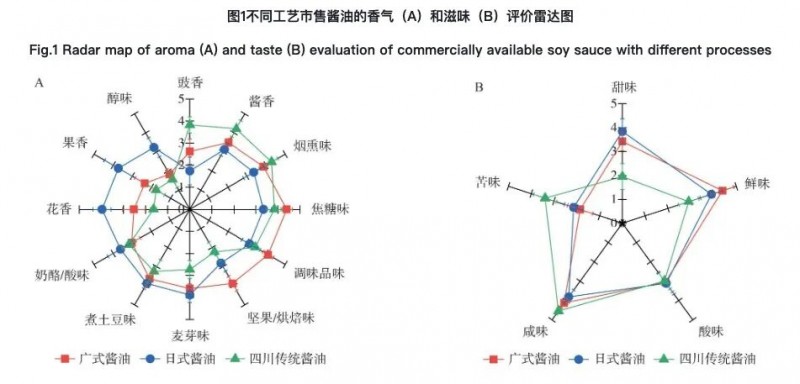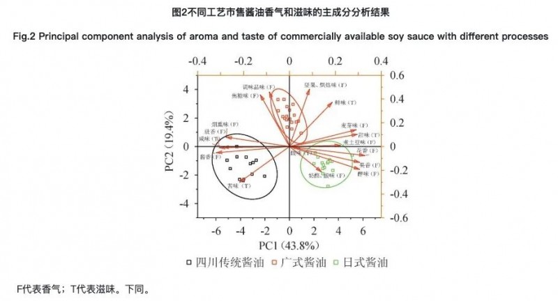 采用QDA法對三種工藝市售醬油進行感官評定,結(jié)果見圖1。由圖1A可知,四川傳統(tǒng)醬油的醬香、豉香和煙熏味突出,其平均強度分別達到4.22、3.83、4.29;而廣式醬油的調(diào)味品味、焦糖味和堅果/烘焙味平均強度最高,分別為4.11、4.40、3.88;日式醬油則花香、果香和醇味突出,其平均強度分別達到3.97、3.73、3.24。廣式醬油與日式醬油的香氣特征與前人研究結(jié)果一致。由圖1B可知,廣式醬油和日式醬油中咸味和鮮味是最強烈的滋味特征,其平均強度分別為4.13、3.81和4.39、3.91;其次是甜味和酸味,而苦味強度較弱。相比之下,四川傳統(tǒng)醬油的滋味特征以咸味為主,平均強度達4.54;而鮮味和甜味相對較弱,平均強度分別為2.91、1.95;且苦味強度較高。不同工藝醬油由于其原料配比、發(fā)酵條件、發(fā)酵菌種及產(chǎn)地等不同導(dǎo)致產(chǎn)品風(fēng)味成分差異,進而影響醬油的感官品質(zhì)。