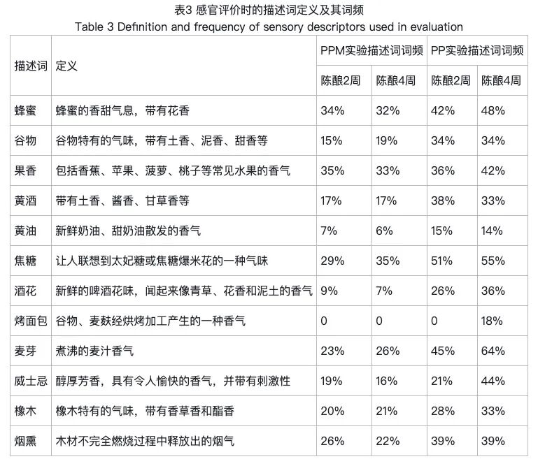 由表3可知,橡木片與樣品接觸2周時,谷物、黃酒、焦糖、酒花、麥芽、煙熏描述詞在PP實驗中的詞頻百分比明顯高于PPM實驗,而蜂蜜、果香、黃油、威士忌、橡木的詞頻百分比在兩個實驗中差別不大。接觸4周時,在PP實驗中收集到了“烤面包味”描述詞。同時,蜂蜜、谷物、黃酒、焦糖、酒花、麥芽、威士忌、橡木、煙熏描述詞的詞頻百分比在PP實驗中更高,但果香、黃油屬性詞頻無明顯差異。